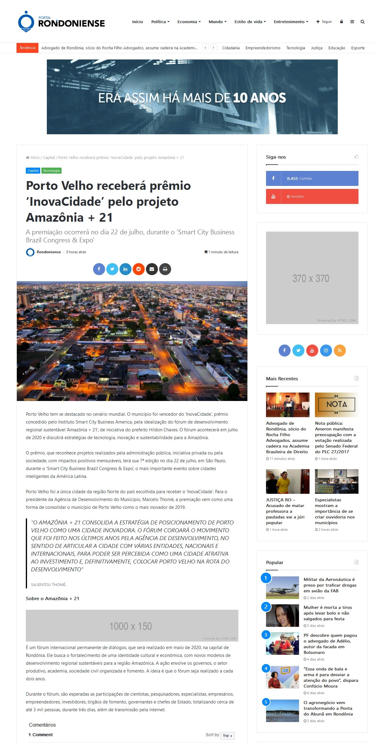 Porto Velho receberá prêmio ‘InovaCidade’ pelo projeto Amazônia + 21
